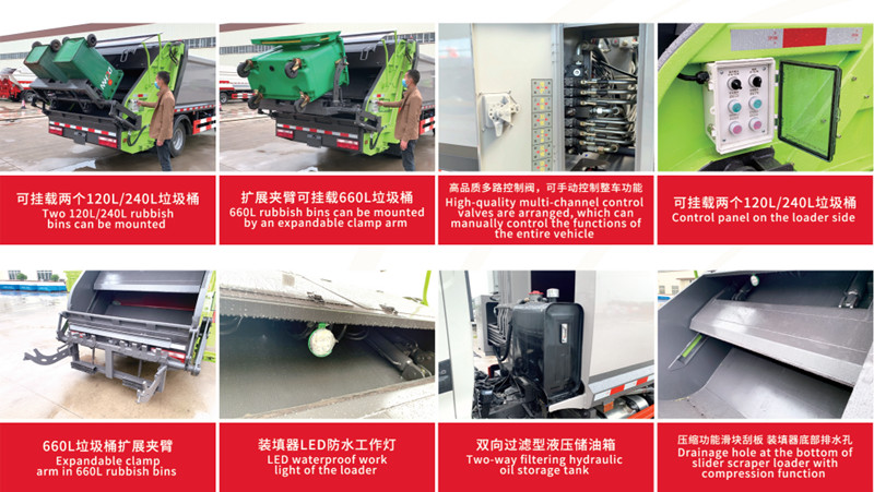 ➤Procesele de încărcare, comprimare și descărcare a vehiculului sunt controlate de o combinație de mecanisme electro-hidraulice, ceea ce face ca operarea să fie simplă și extrem de automatizată.