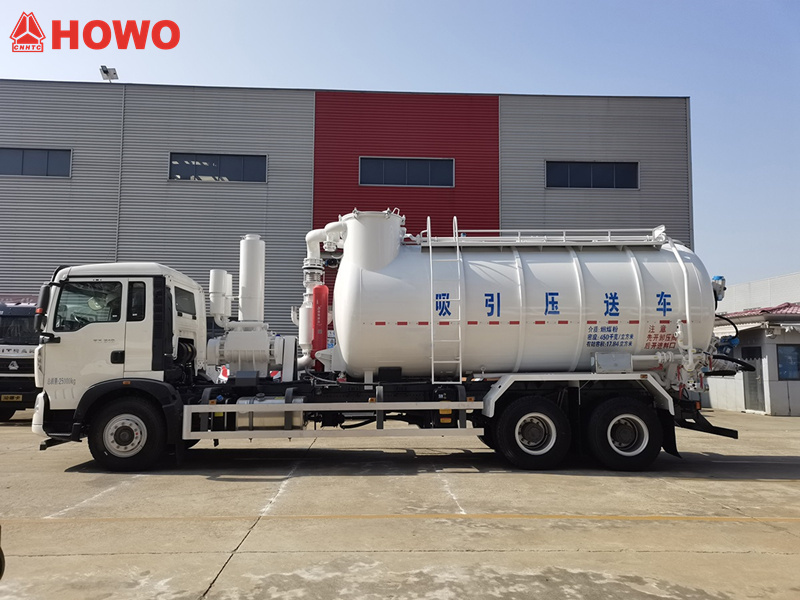 Camionul HOWO 6x4 cu transportor de aspirație și presiune de 15 mcb este modificat după șasiul HOWO TX din seria 6x4. Are un ampatament de 5800 mm + 1350 mm și este echipat cu un motor Sinotruk MC07.31-60 de 310 cai putere și o transmisie HW13709XST cu 9 trepte. Este echipat cu un rezervor de încărcare (în principal pentru încărcarea materialelor pulverulente și granulare, cu o scară exterioară sudată și o pasarelă, urechi de ridicare, orificii de observare și un indicator de nivel sudat pe partea superioară a rezervorului), un dispozitiv de aspirație, un dispozitiv de descărcare, un sistem de filtrare (saci filtranți) și un sistem de operare în partea din spate. Este echipat cu o pompă de vid YIFENG SK-15 și un compresor de aer BDW-10/2.