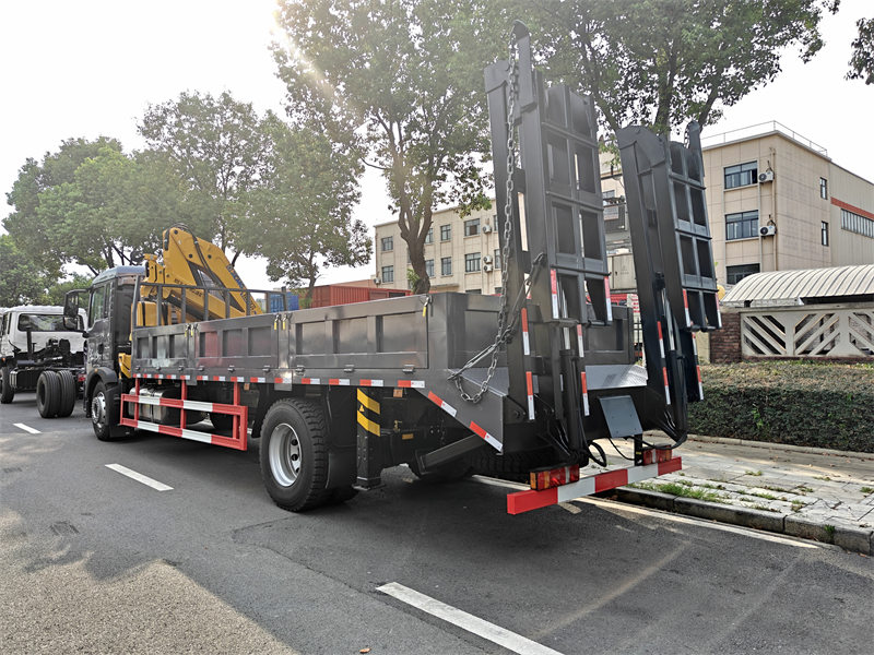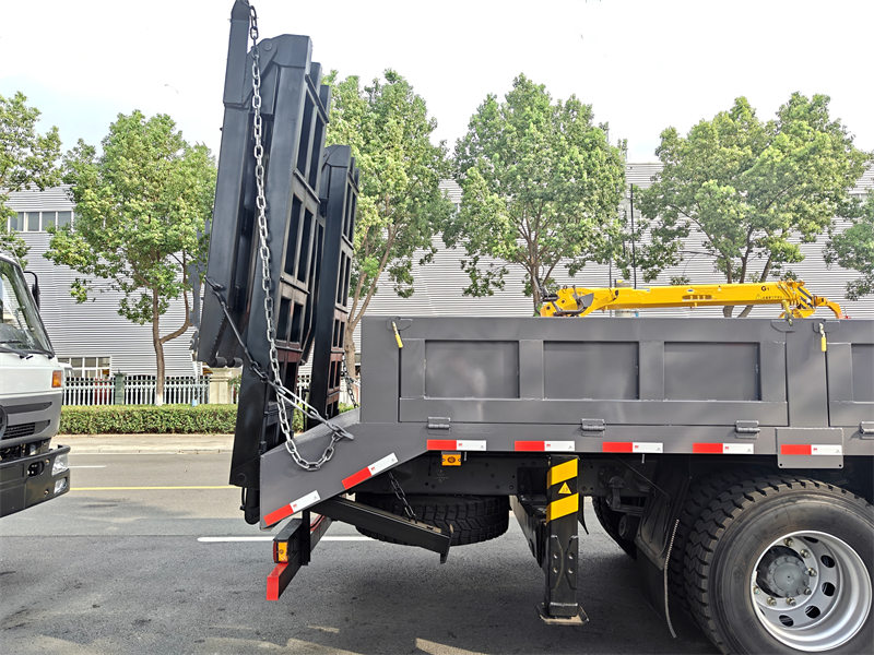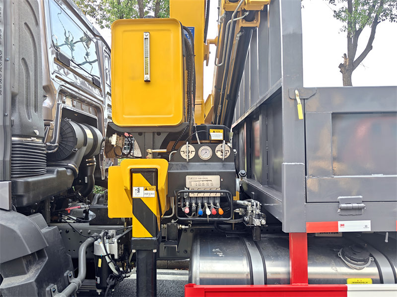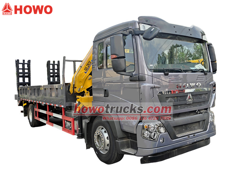♦ Camionul de marfă Howo 4x2 este echipat cu o macara cu braț articulat de 6 tone (cuplu de 10 tone/înălțime de 8,6 m) și o funcție de transport cu platformă de 20 de tone..