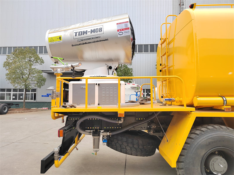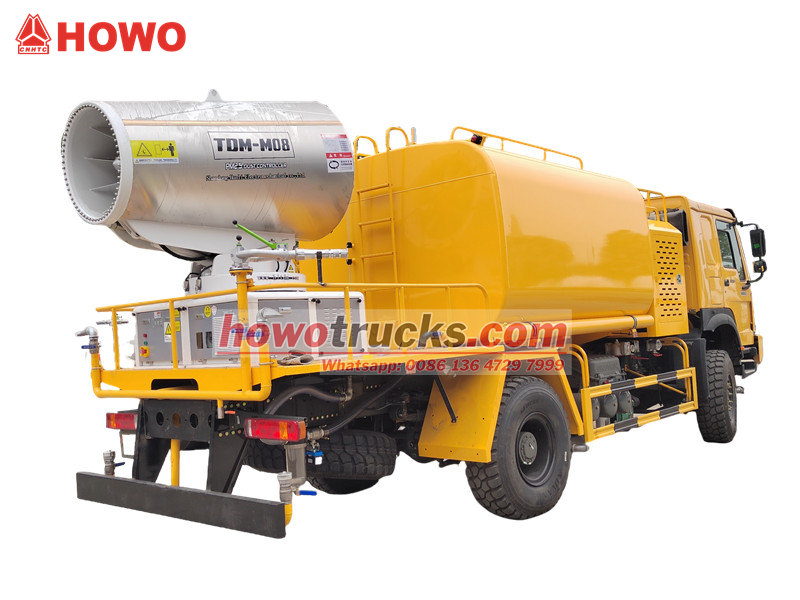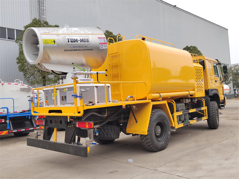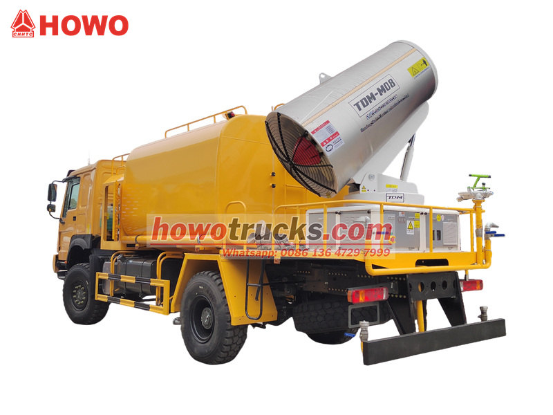 Camionul cu tun de apă HOWO 4×4 este construit pe șasiul HOWO cu tracțiune integrală, echipat cu un motor de 300 CP și un sistem de propulsie 4×4, oferind performanțe remarcabile pe terenuri complexe. Dispunând de un tun de apă cu rază ultra-lungă de acțiune de 80 de metri și 90 de duze, acesta poate pulveriza o ceață fină de apă (20-200 μm) cu o suprafață maximă de acoperire de 20.000 m². Combinat cu un rezervor de apă de mare capacitate de 10.000 litri și un sistem de pulverizare de înaltă presiune, acesta îndeplinește eficient sarcini precum reducerea prafului de pe șosea, suprimarea prafului de pe șantierele de construcții și pulverizarea agricolă. Este potrivit în special pentru controlul prafului în zonele miniere, porturi, protecția mediului urban și alte domenii.