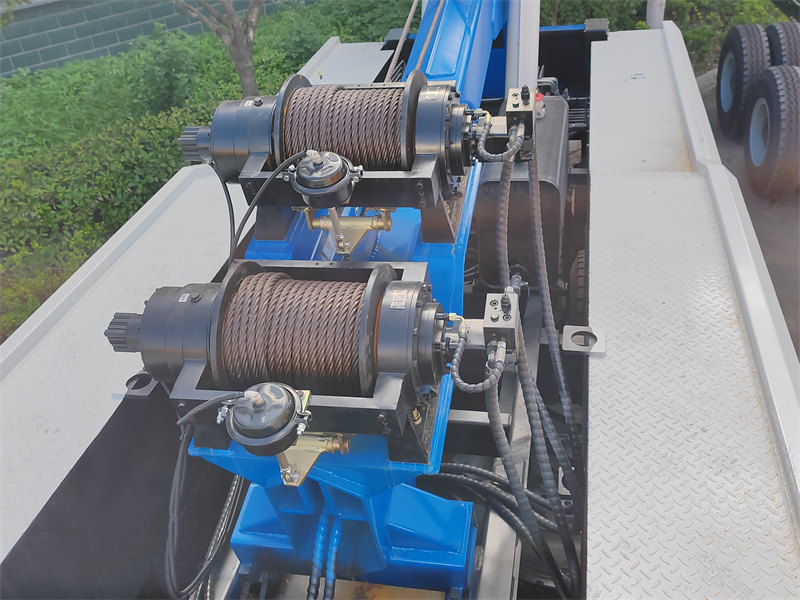 3. Funcția de troliu: Camioanele de tractare grele sunt echipate cu două trolii. Acestea funcționează împreună cu brațul principal și punctele de ancorare de la fața locului (scripeți fixe) pentru a efectua diverse operațiuni, cum ar fi redresarea vehiculelor răsturnate și trolierea vehiculelor care s-au rostogolit în șanțuri adânci.