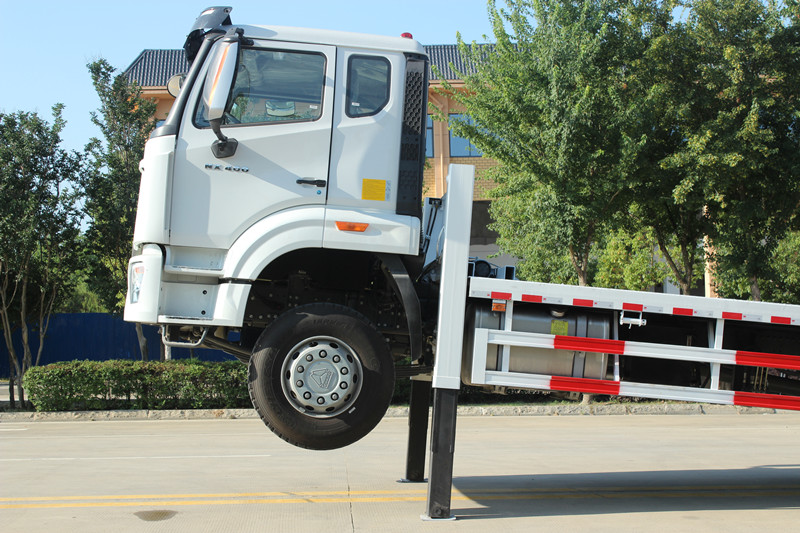 ◇Stabilizatoare hidraulice: Vehiculul este echipat cu două stabilizatoare hidraulice de mare capacitate în față. Acestea sunt coborâte în timpul operațiunilor de încărcare și descărcare pentru a oferi un suport frontal stabil pentru vehicul, prevenind înclinarea părții frontale a vehiculului și asigurând un proces de încărcare și descărcare sigur și fără probleme.