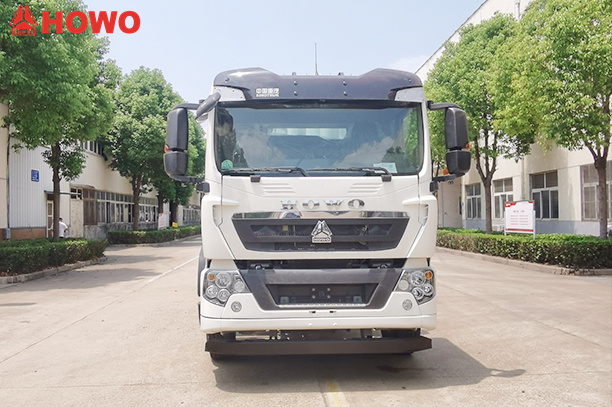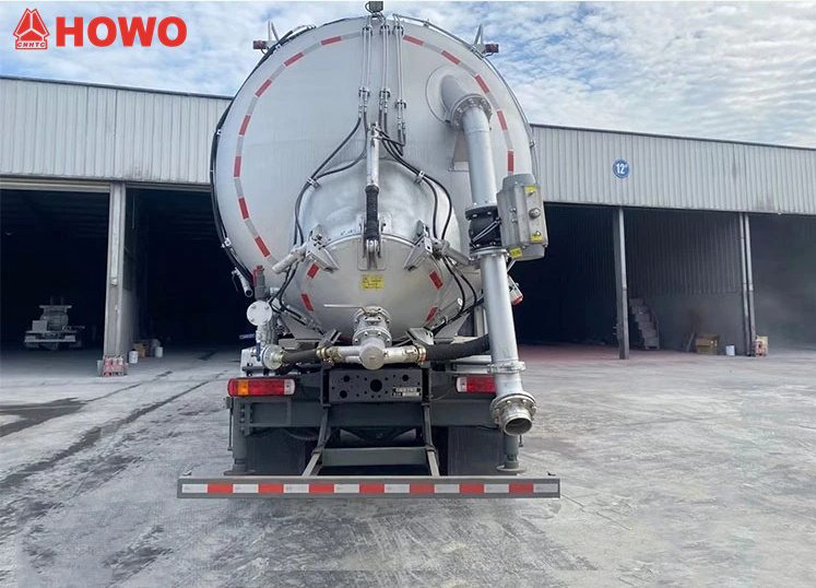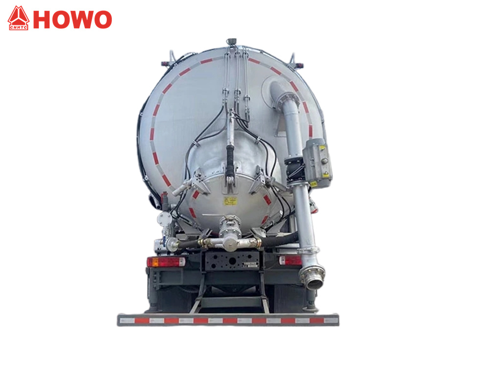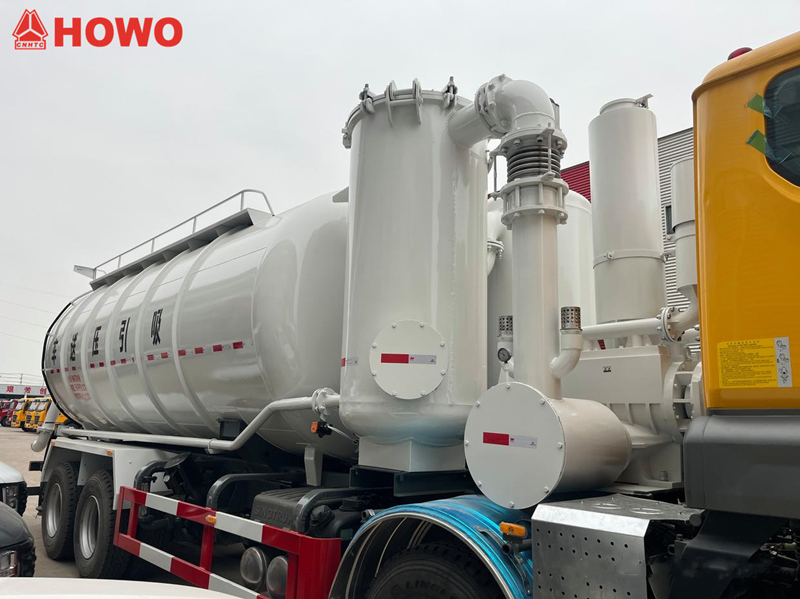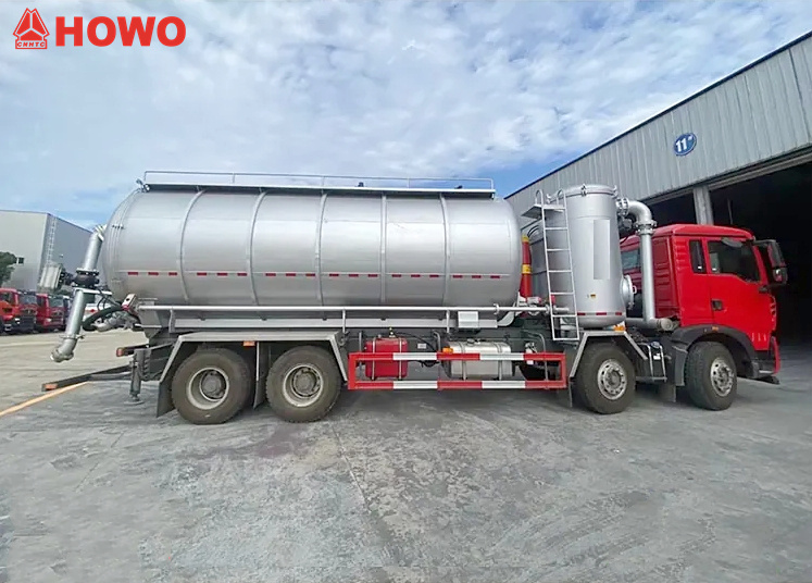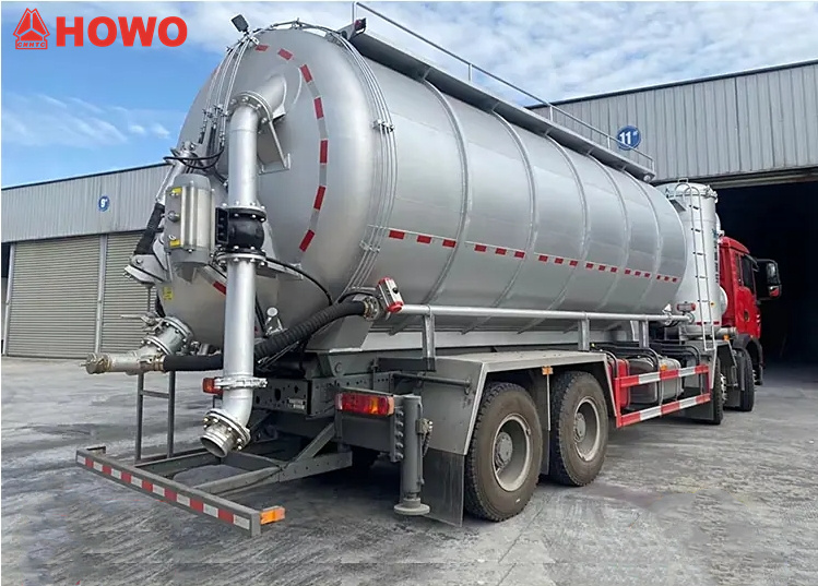 Vehicul HOWO 8x4 cu transportor de aspirație și presiune de 25 m³, modificat pe șasiu HOWO TX350 8x4, cu un ampatament mare de 1800+4600+1350 mm, echipat cu motor Sinotruk MC07H.35-60 și cutie de viteze HW15710L. Partea superioară a caroseriei este complet echipată cu filtre cu saci, iar partea din spate este un rezervor de stocare. Este echipat cu stabilizatori hidraulici, ventilatoare, conducte de admisie a aerului extern, pompe de vid, compresoare de aer, cilindri de ridicare, sisteme de filtrare, sisteme de conducte de aspirație și refulare, cutii electronice de control etc. Pompa de vid are aspirație sub presiune negativă, iar compresorul de aer are refulare sub presiune pozitivă.