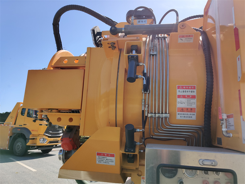 1. Sistem de aspirație cu vid: O pompă de vid Jurop PVT400 generează presiune negativă, care este apoi aspirată într-un rezervor din oțel carbon de 6,7 metri cubi prin intermediul unui braț de aspirație. O supapă de preaplin este instalată pe partea superioară a rezervorului, care declanșează automat o alarmă de preaplin și închide orificiul de aspirație pentru a preveni refluxul. Brațul de aspirație este reglabil hidraulic pentru ridicare, retragere și rotire, pentru a se adapta la diverse poziții de funcționare.
