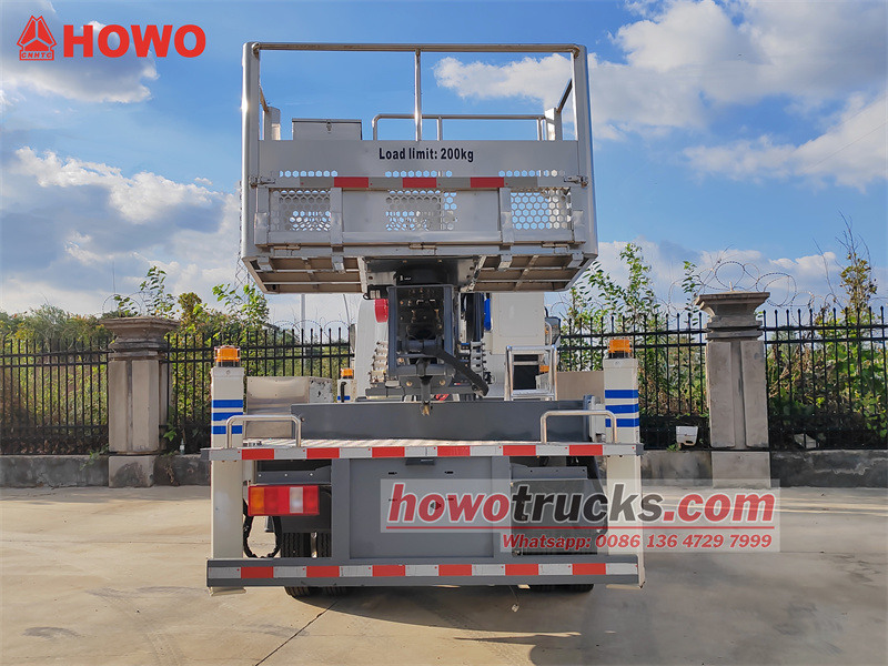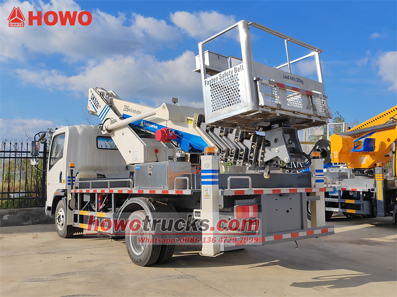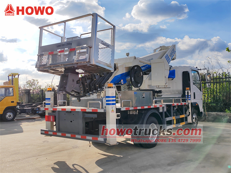 Acest camion cu platformă de lucru aeriană Sinotruk RHD are un șasiu de camion ușor HOWO RHD cu un ampatament de 4500 mm. Este echipat cu un motor Weichai WP2.3Q140E62 și o transmisie WLY6TS55. Partea superioară a șasiului are un braț telescopic cu 6 secțiuni, acționat de la sol și o platformă rotativă.cutie de controlsau prin telecomandă. Se poate roti la 360 de grade grade, are patru stabilizatoare hidraulice, o capacitate maximă de încărcare a cupei de 200 kg, panouri din aliaj de aluminiu și o pasarelă antiderapantă cu model. De asemenea, include lumini de funcționare pe timp de noapte.