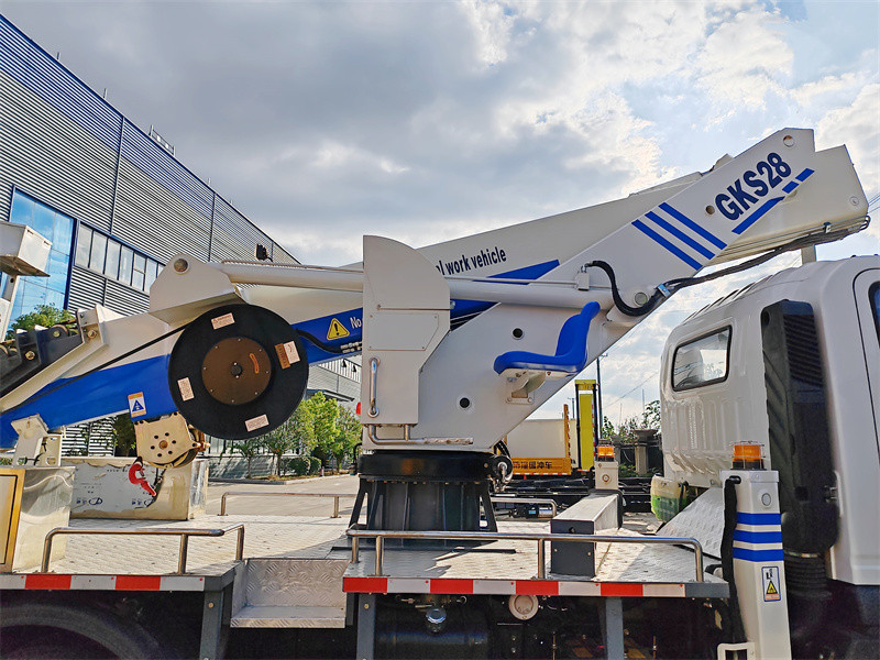 • Braț de lucru: Brațul telescopic de înaltă rezistență, cu cinci secțiuni, are un design hexagonal pentru o înălțime mare rezistență structurală, extensie și retragere sincronizate, mișcare lină și o gamă largă de lucru.Înălțime maximă de lucru 28 m, Rază maximă de lucru 14,5 m